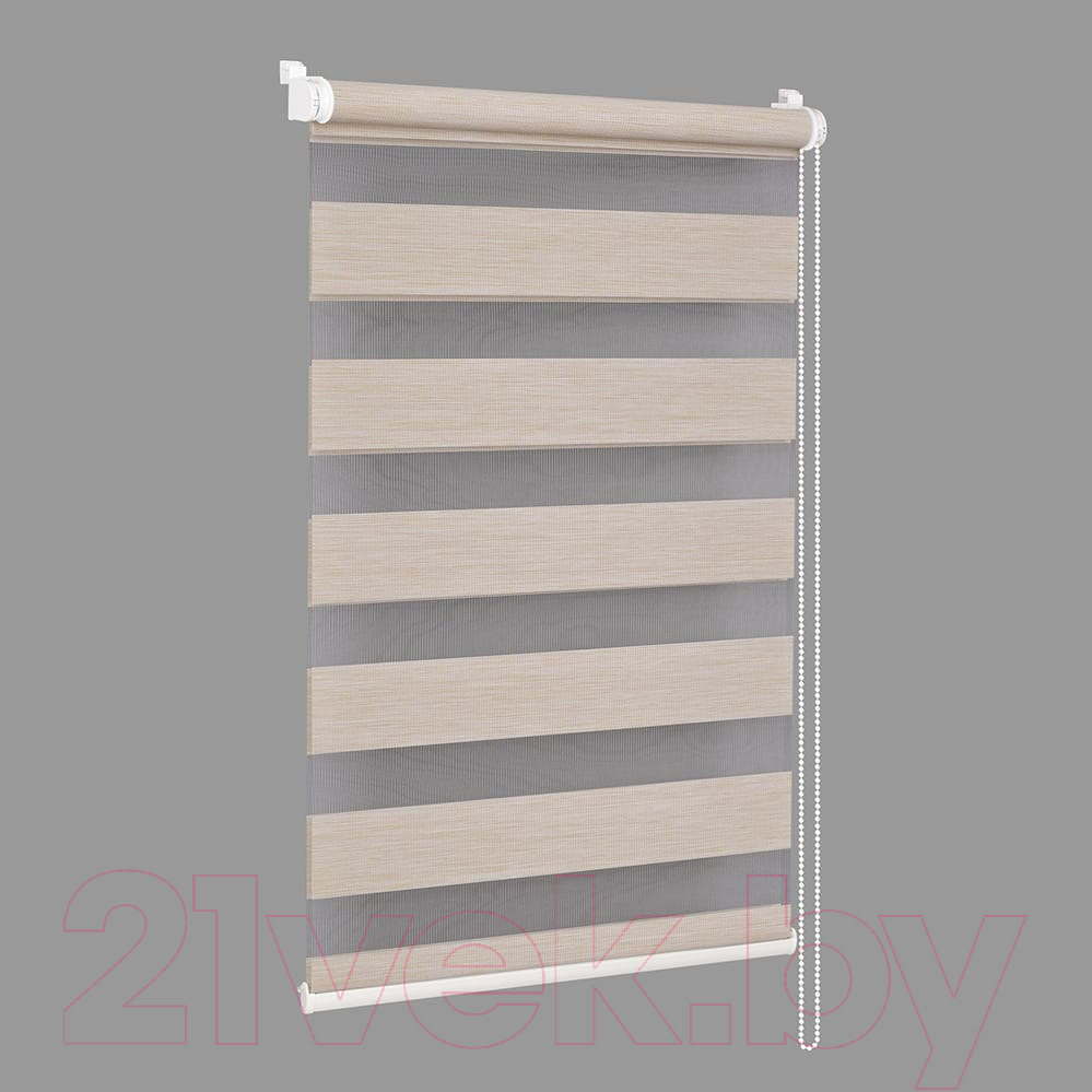 Рулонная штора «День-ночь» состоит из ткани, с чередующимися полосами из прозрачного и непрозрачного материала, расположенной в два слоя. Уникальность двойной рулонной шторы заключается в её универсальности. Она имеет и привлекательный внешний вид, и легка в управлении, даёт возможность контролировать интенсивность солнечного света, непосредственно на самом изделии.