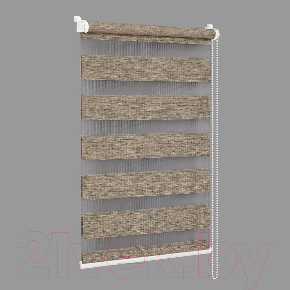 Рулонная штора «День-ночь» состоит из ткани, с чередующимися полосами из прозрачного и непрозрачного материала, расположенной в два слоя. Уникальность двойной рулонной шторы заключается в её универсальности. Она имеет и привлекательный внешний вид, и легка в управлении, даёт возможность контролировать интенсивность солнечного света, непосредственно на самом изделии.