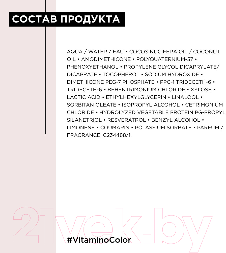 Состав: Aqua/Water/Eau, Cocos Nucifera Oil/Coconut Oil, Amodimethicone, Polyquaternium-37, Phenoxyethanol, Propylene Glycol Dicaprylate/dicaprate, Tocopherol, Sodium Hydroxide, Dimethicone Peg-7 Phosphate, Ppg-1 Trideceth-6, Trideceth-6, Behentrimonium Chloride, Xylose, Lactic Acid, Ethylhexylglycerin, Linalool, Sorbitan Oleate, Isopropyl Alcohol, Cetrimonium Chloride, Hydrolyzed Vegetable Protein Pg-propyl Silanetriol, Resveratrol, Benzyl Alcohol, Limonene, Coumarin, Potassium Sorbate, Parfum/Fragrance. C234488/1.